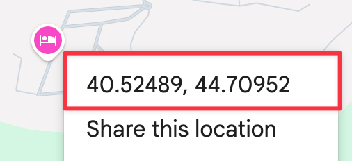 You can copy the location coordinates from Google Maps by right clicking on a location. The coordinates should be at least 4 decimal points long: